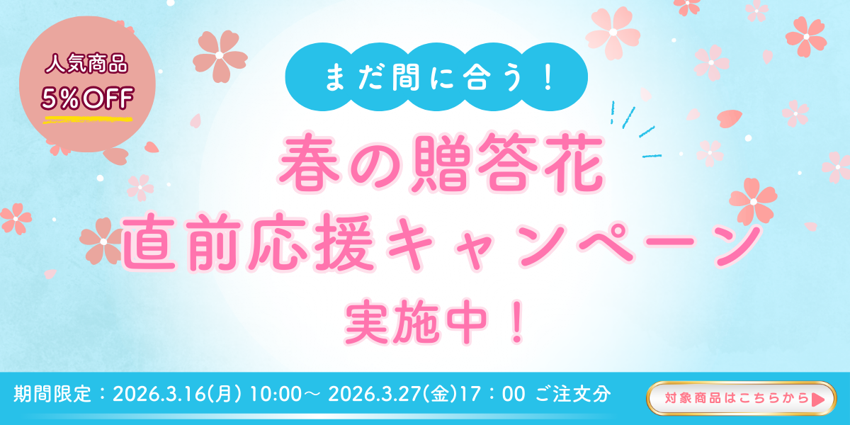 お客さま各位 平素より当サービスをご利用いただき、誠にありがとうございます。 贈答花の需要期に伴い、4月1日お届け分のご注文につきましては、3月27日(木)17:00をもって締め切りとさせていただきます。 なお、お急ぎ便につきましても同日時(3月27日17:00)で受付終了となります。 グランブーケ大多喜指定の商品につきましては、ご注文締切を、3月25日(水)17:00とさせていただきます。対象商品は、商品番号:B00030~B00037 となります。 それ以降にいただいたご注文の最短お届け日は、4月2日以降となりますので、お早めのご注文をお願いいたします。 お客さまにはご不便をおかけいたしますが、何卒ご理解のほどよろしくお願い申し上げます。